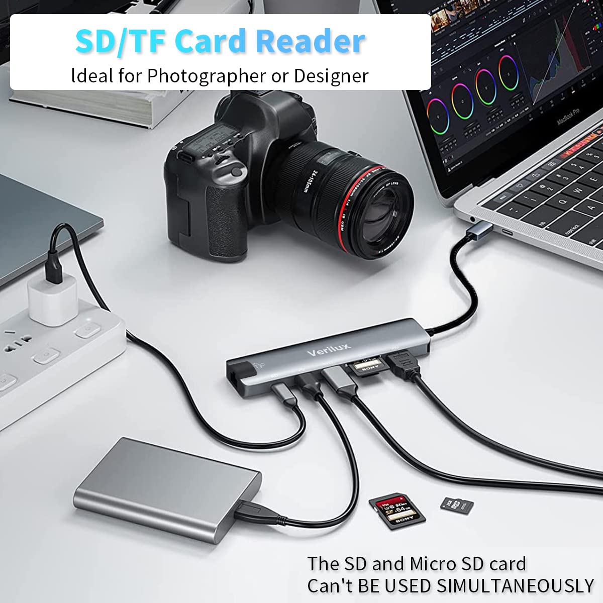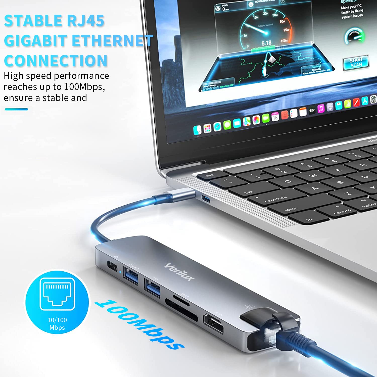 Verilux USB C Hub with Ethernet RJ45 7 in 1 USB Type C Hub offers versatile connectivity for modern laptops and tablets. Designed with USB 3.0 and USB 2.0 ports for stable and fast data transfer up to 5 Gbps, it allows multiple devices to work simultaneously. The integrated SD and TF card reader simplifies direct access to files, while the HDMI output supports 4K display connection. Its Ethernet port ensures a more reliable wired network compared to wireless connections, and the 87W PD charging port maintains power for connected devices. Ideal for productivity and daily use, this Verilux hub enhances efficiency and supports trust in reliable device compatibility.