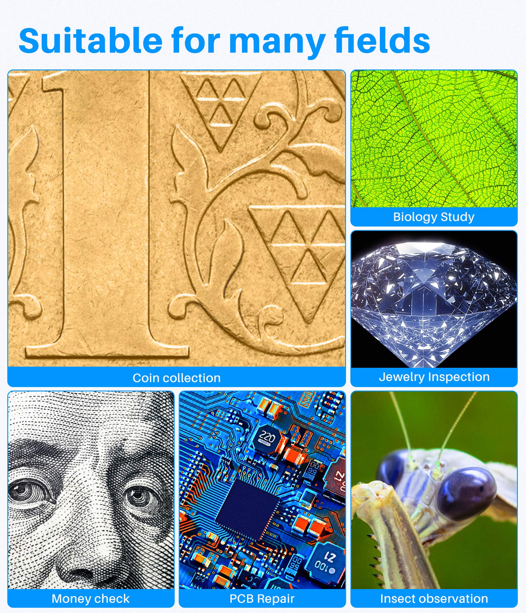 - Includes an adjustable stand for hands‑free inspection and stability.