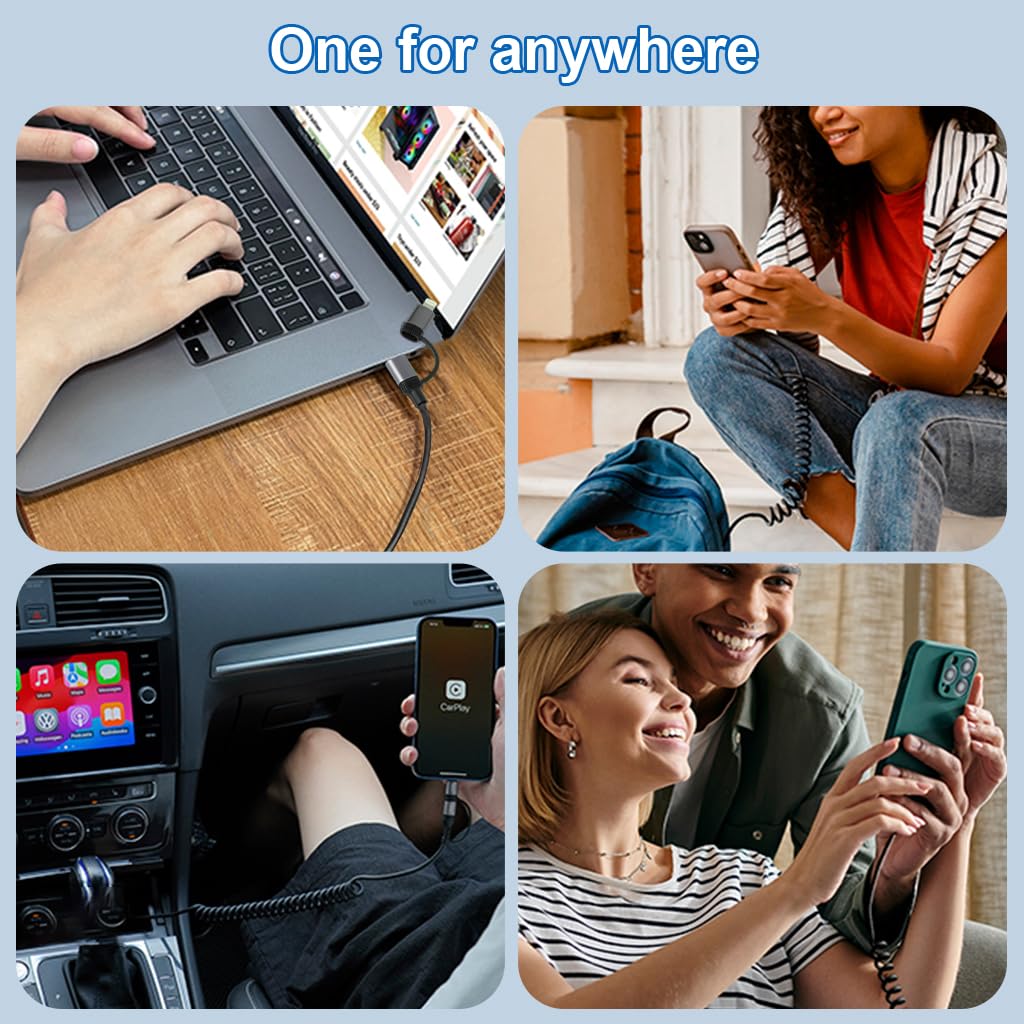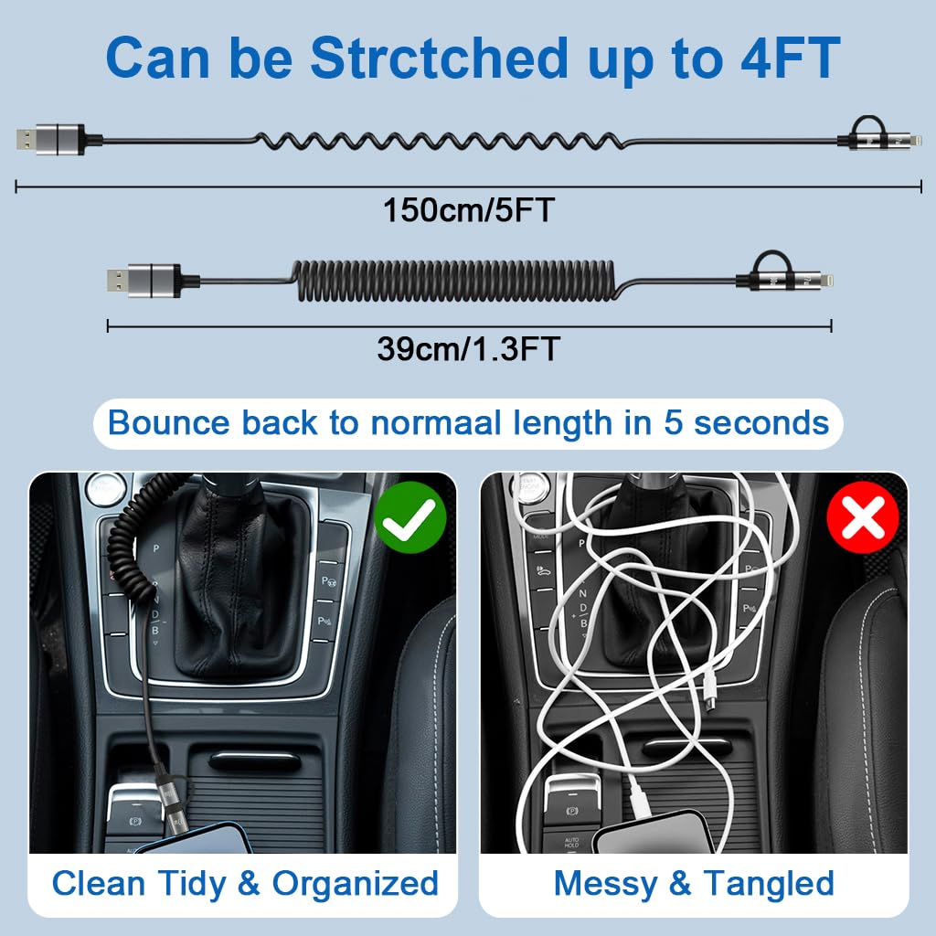 Verilux 4 in 1 C Type Charger Cable with Spring 4FT/1.2M is a multifunctional charging and data cable designed for everyday use. Featuring a unique spring coiled structure, the cable extends easily when needed and retracts to prevent tangles and save space. Its 4-in-1 design integrates USB-C, Lightning, and USB-A connectors, supporting PD 60W fast charging and 480Mbps data transfer for compatible devices. Built with durable materials and metal connectors, it ensures reliable performance and longevity under frequent use. This Verilux cable offers a practical solution for users who need efficient charging and data transfer across multiple devices at home, in the office, or while traveling.