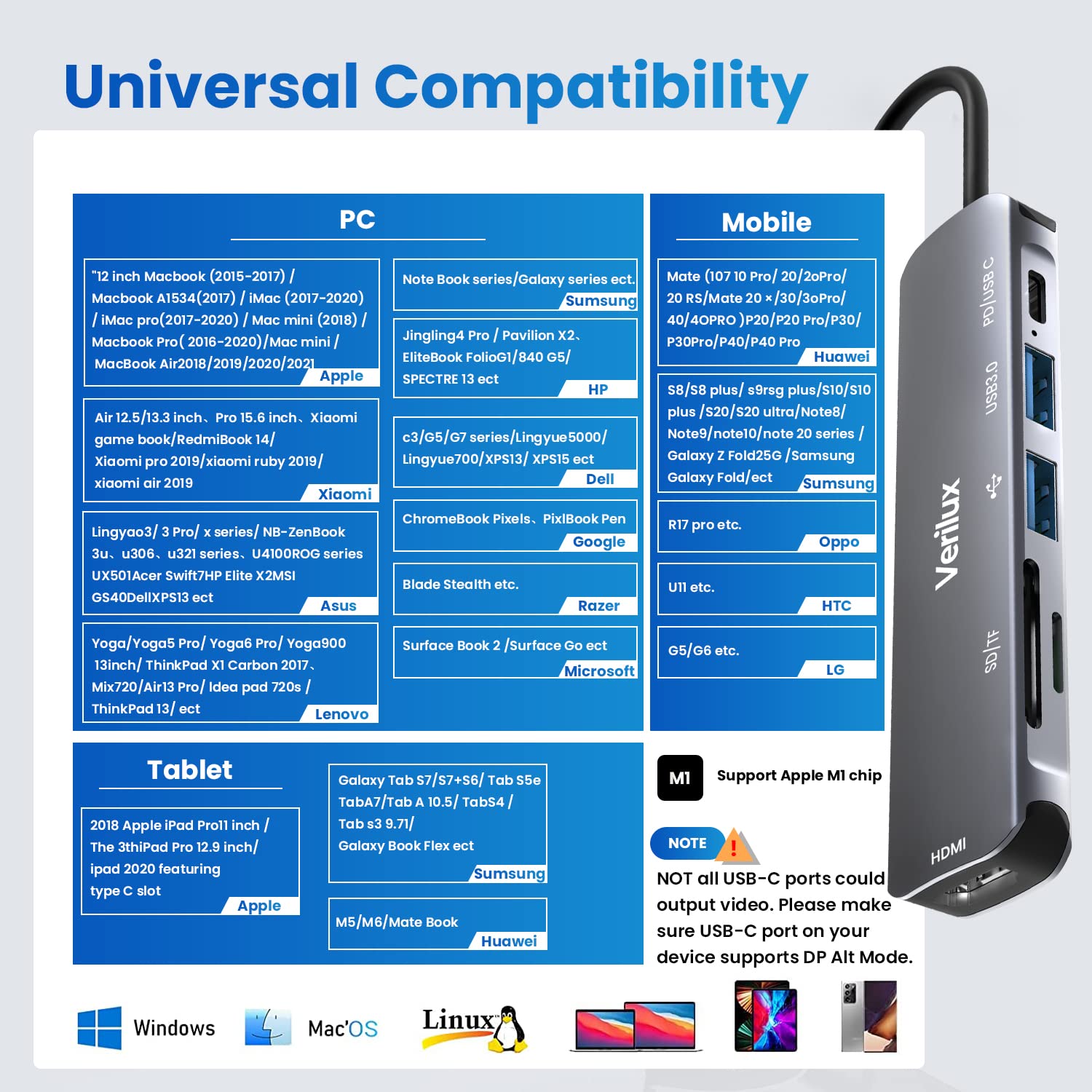 Verilux USB C Hub Multiport Adapter 6 in 1 Portable Aluminum USB Extender offers a convenient way to expand connectivity for Type-C laptops and tablets. Built with a durable aluminum body, this Verilux hub includes a 4K@30Hz HDMI port, USB 3.0 and 2.0 ports, 87W PD fast charging, and SD/Micro SD card readers to transform your device into a compact workstation. Supporting data transfer speeds up to 5Gbps, it enables easy connection for peripherals such as keyboards, mice, and storage devices. Compatible with MacBook Pro, MacBook Air, Chromebook Pixel, Dell XPS, and select Samsung Galaxy models, this hub provides reliable performance and stable power delivery for efficient multitasking and professional use.