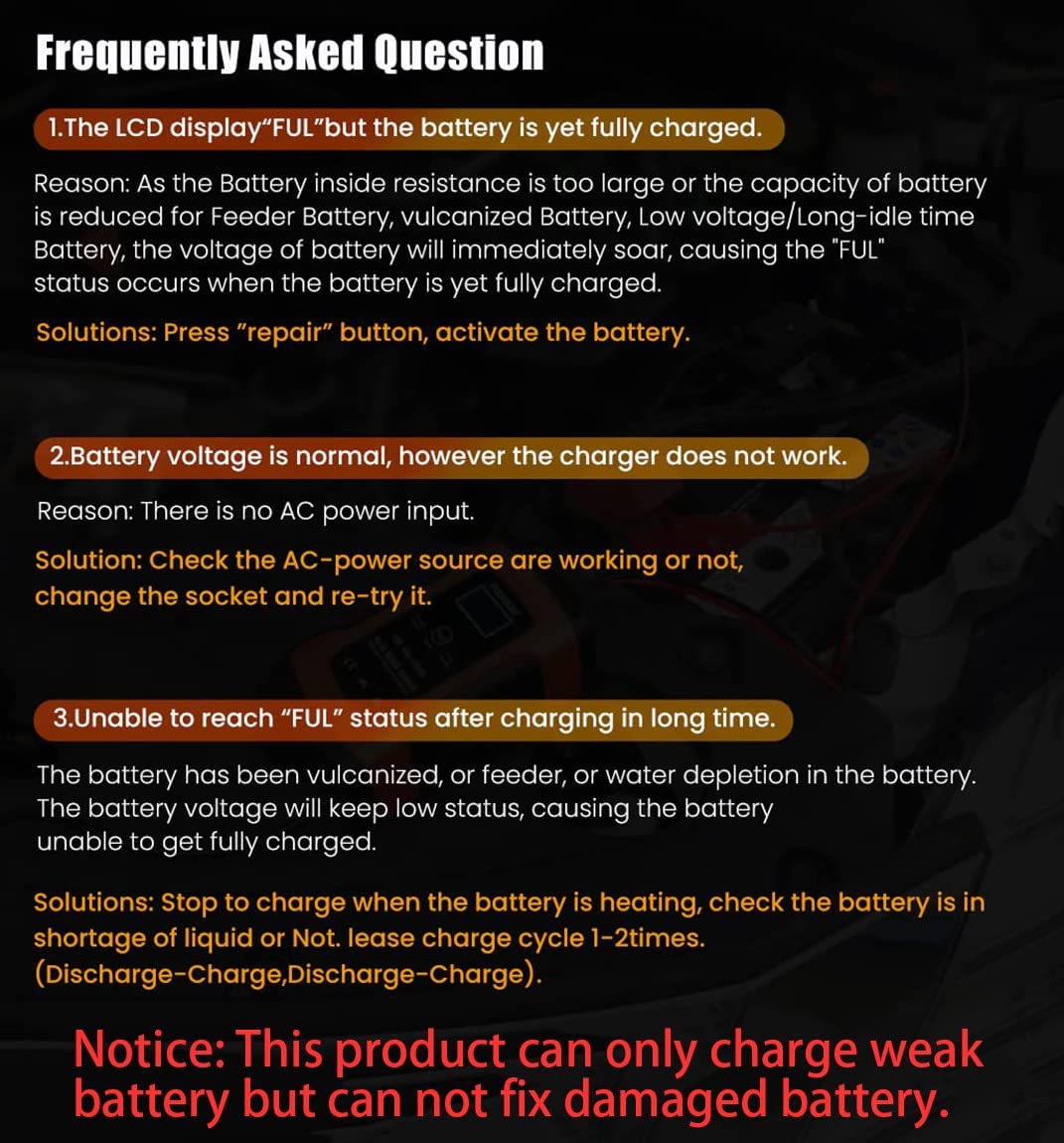 - Features pulse repair technology to help recover inactive or low-performance batteries for extended lifespan.