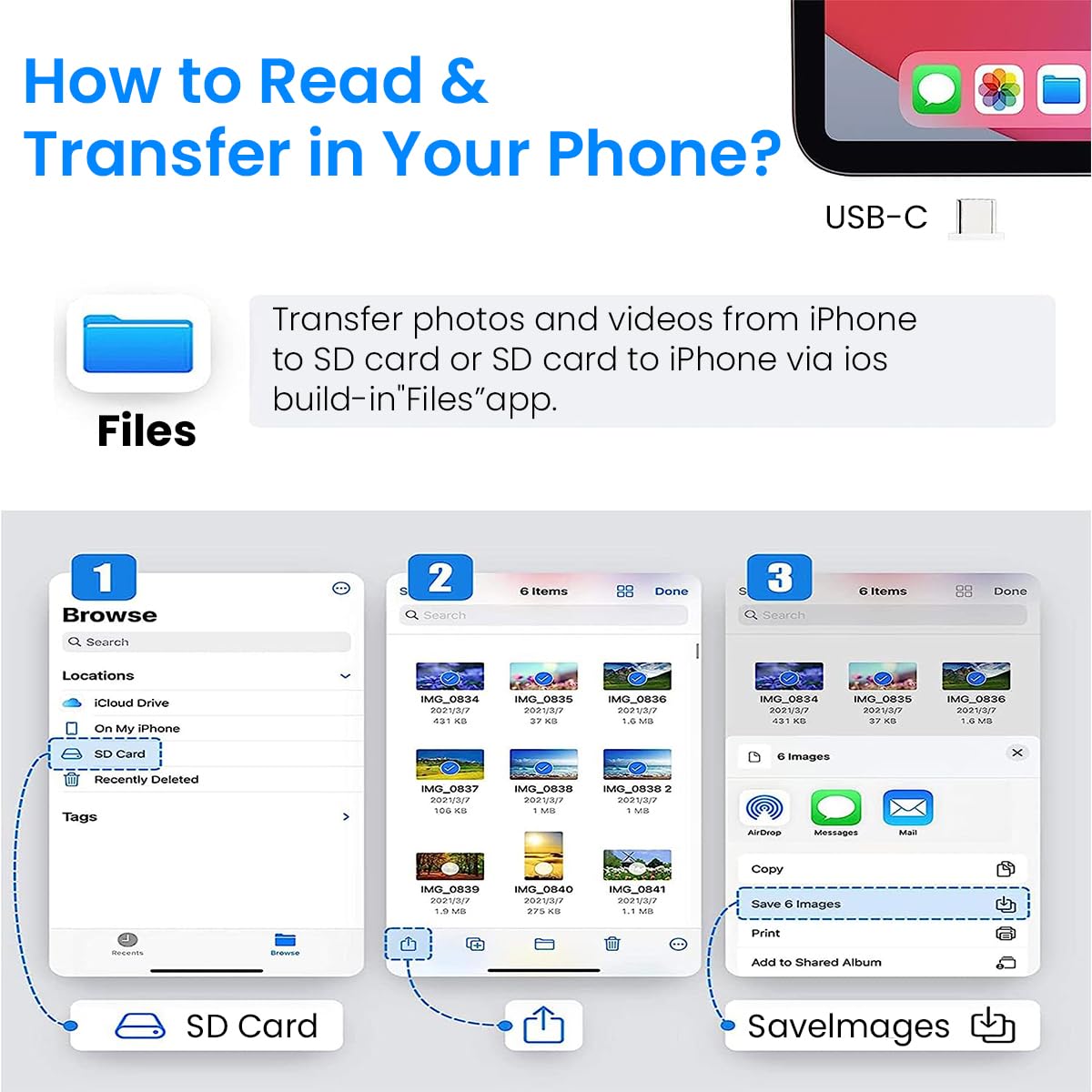 • Durable 5-in-1 structure integrates USB-A, USB-C, Lightning, SD, and Micro SD interfaces for flexible connectivity.