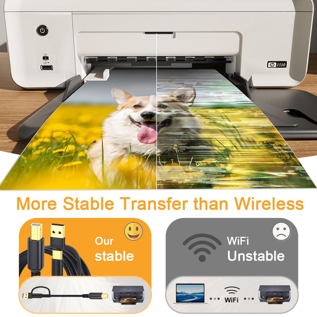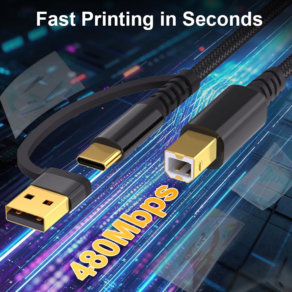 Verilux 2 in 1 USB Printer Cable offers a versatile connection solution for printers and scanners through dual USB C and USB 2.0 Type-A connectors. Supporting data transfer speeds up to 480Mbps, this cable enables reliable and efficient printing or scanning performance for home or office use. Its plug and go functionality eliminates the need for additional drivers, ensuring simple setup and immediate operation. The 6.6-foot nylon braided design enhances durability and flexibility while resisting tangles and wear from everyday use. With practical length and sturdy construction, this Verilux printer cable provides dependable connectivity and long-lasting performance across various devices and printing environments.