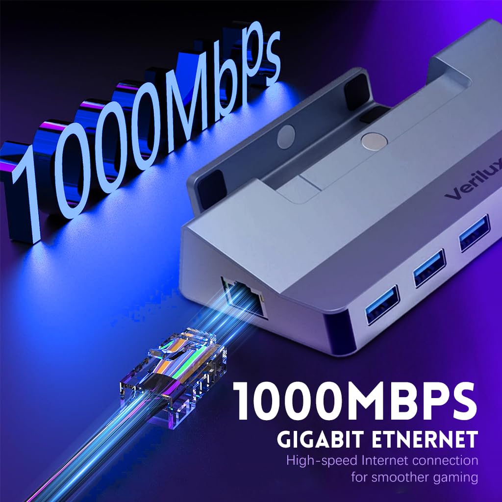 Verilux USB Hub Type-C Dock Station for Steam Deck offers multifunctional connectivity and reliable performance for gaming and productivity. Designed to support 4K@60Hz video output through its HDMI port, this dock delivers sharp and fluid visuals on suitable displays. It features multiple connection interfaces including a Type-C PD charging port, three USB 3.0 ports, and an Ethernet port for stable data transfer. The 100W PD fast charging capability helps keep devices powered efficiently, while the integrated stand provides a convenient setup angle. Built with a compact, portable structure, the Verilux dock station enhances usability for Steam Deck, ROG, and Switch users, ensuring a practical and trustworthy accessory for everyday use.