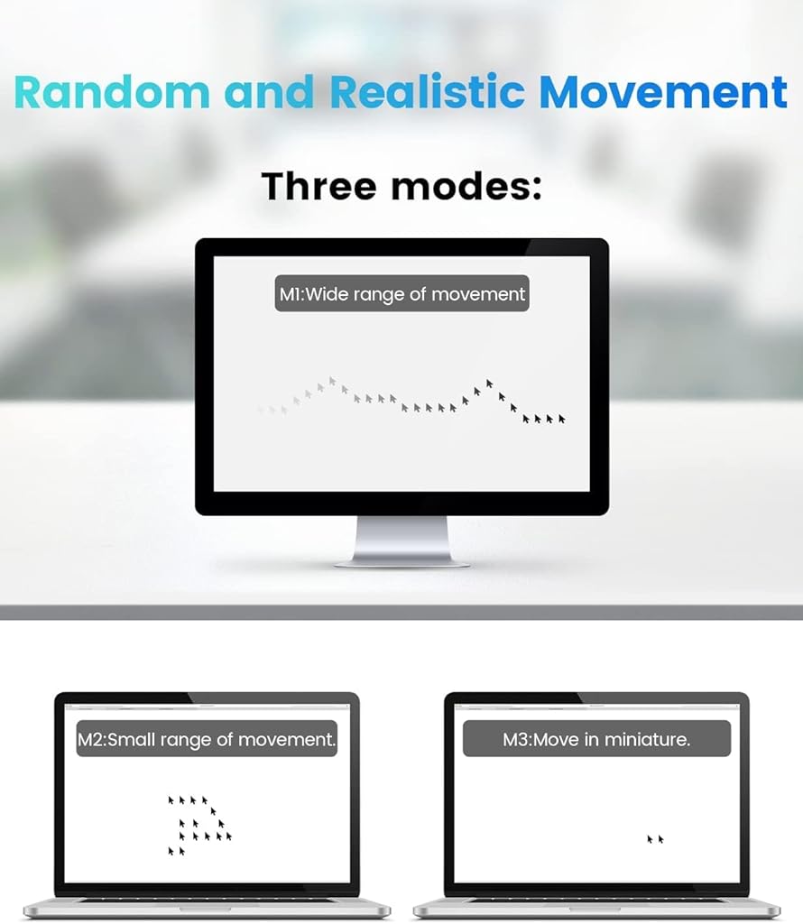 • VERSATILE JIGGLE SETTINGS: Experience unmatched activity simulation with 3 unique jiggle amplitudes: "wide range jitter", "small range jitter", and "slight jitter" for minimal movement. Switch seamlessly with a dedicated button, ensuring your screen stays alive without hindering daily mouse usage.