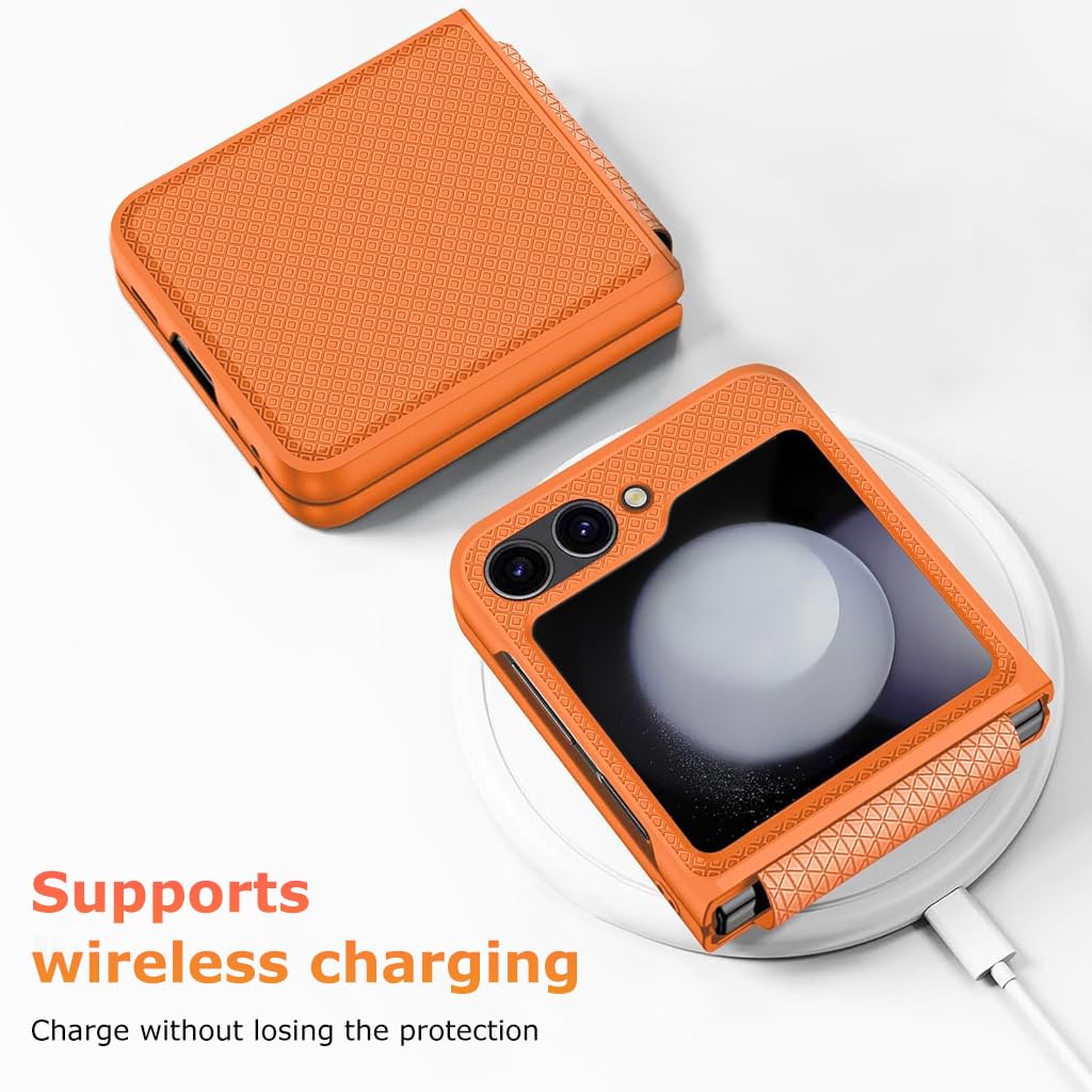 • STYLE MEETS RELIABLE PROTECTION: The phone case's reinforced edges and enhanced outer display design protect your camera and screen from scratches or impactseven during accidental face-up fallsgiving you peace of mind. While its bright orange color adds a bold, vibrant touch, the case balances style and functionality, making your Galaxy Z Flip 6 stand out effortlessly while staying protected.