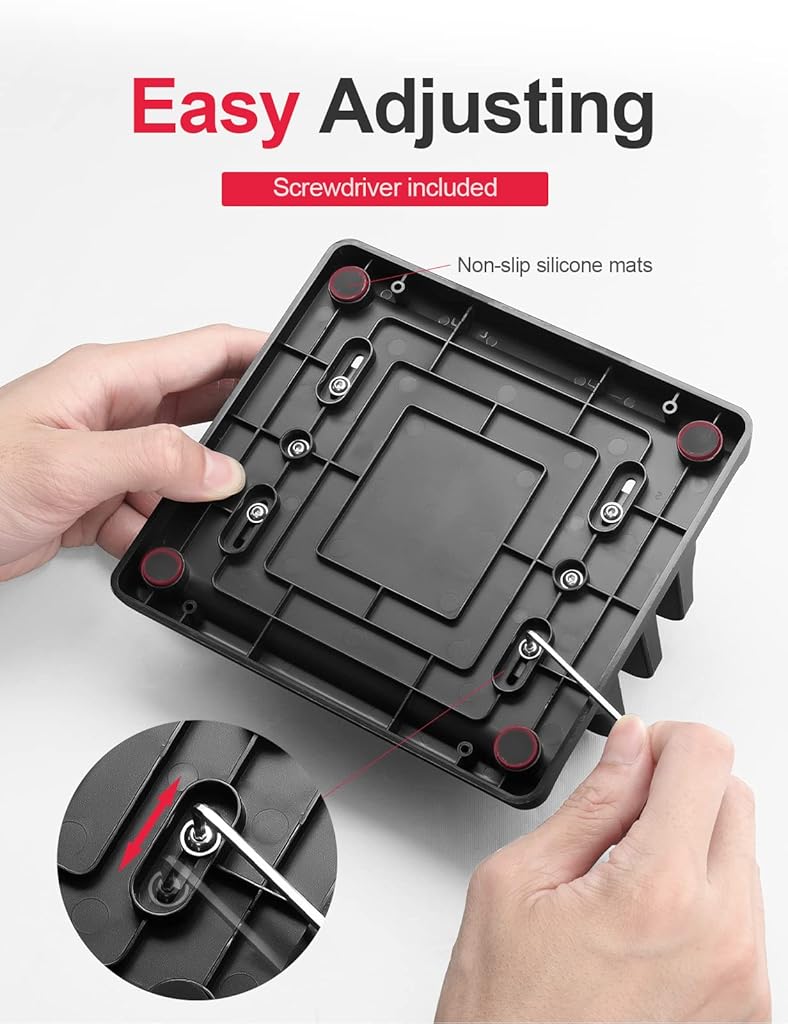 • ADJUSTABLE SLOT WIDTH: Laptop stand can work for most laptop or pad within 17.3''. Thanks to the laptop stand holder sliding board design. That allowing you to adjust the width of laptop dock between 2 boards from 1.4-4cm. Laptop holder stand with can keep a well balance for different device, more stable to use.
